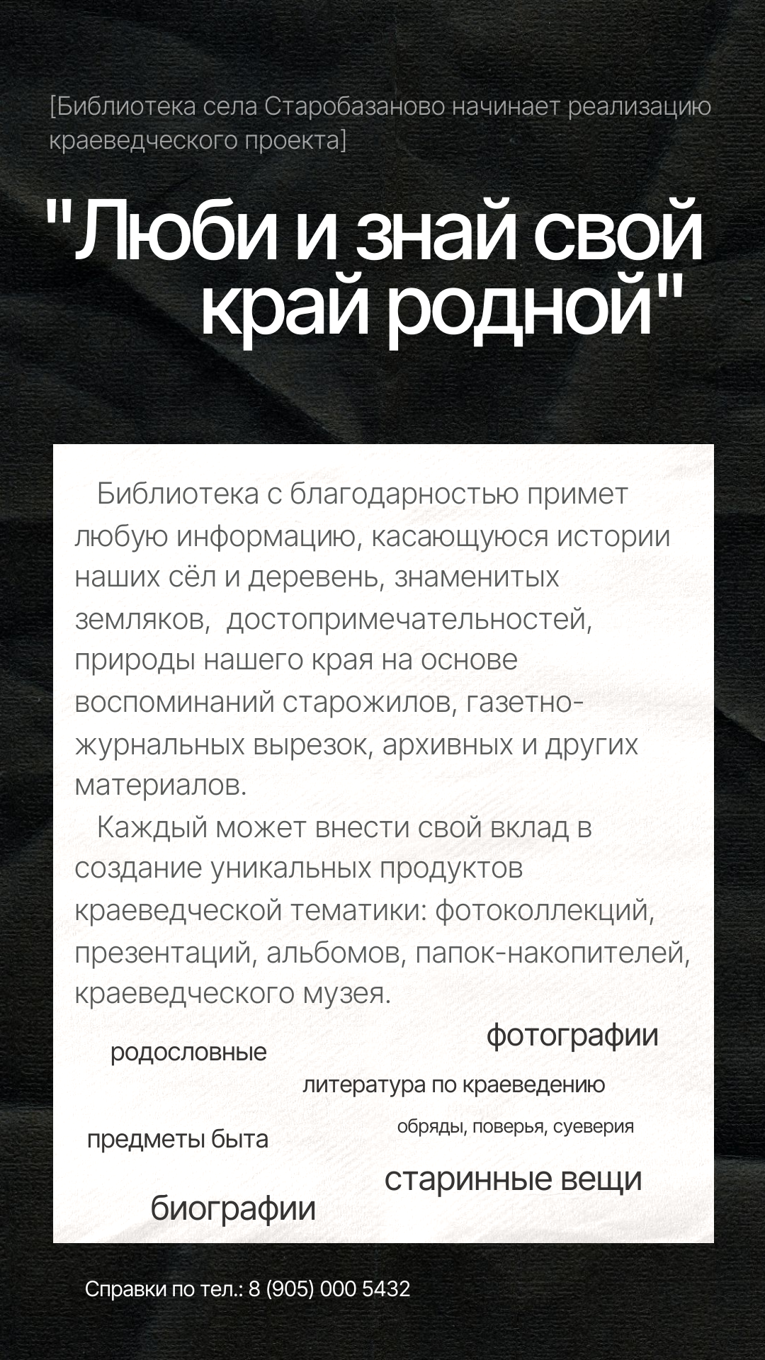 Ждём от неравнодушных жителей для сканирования/ксерокопирования фотографии, газетно-журнальные вырезки, генеалогические древа (родословные), записи воспоминаний старожилов, старинные вещи, литературу по краеведению.
