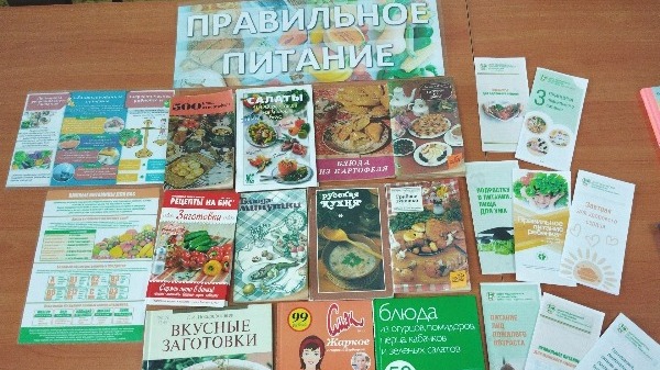 В библиотеке оформлена тематическая выставка "Здоровое питание". На ней представлены книги с рецептами блюд на каждый день и праздники, заготовок на зиму.